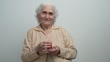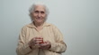 Beautiful old Turkish lady in front of a white background drinking tea and smiling to the camera
