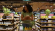 Black young woman leaning on the shopping cart while walking through the supermarket and checking her shopping list on smartphone - 4K stock video
