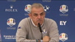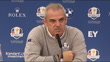 Ryder Cup: Build-up begins; SCOTLAND: Gleneagles:EXTClose shot groundsman cutting grass with scissorsWide shot golf courseGVs Rory McIlroy (Team Europe) practisingINT** BEWARE FLASH PHOTOGRAPHY **Paul McGinley (Team Europe captain) and Tom Watson (Team USA captain) handshake before press conferencePaul McGinley (Team Europe captain) press conference SOT- It's special and that's what you have in Scotland - it is the home of golfTom Watson (Team USA captain) press conference SOT- This event is special in the world of sport and I love it - this is where I want to be
