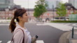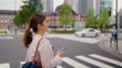 Businesswoman crossing street in financial district in city - 4K stock video