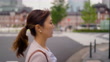 A businesswoman is crossing the street in a financial district in the city.
