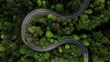 Curved road winds through the dense green forest. Sustainability and e-mobility combined in one image. The motif reflects the desire to travel on a road trip and stands for freedom and travel by an electric car. The electric vehicles drive through the forest and the beautiful nature. Top-Down perspective from a birds eye view captured with the drone.
