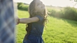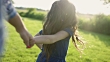 A mother and daughter are enjoying themselves outdoors. The daughter is holding the mothers hand, leading her through the grass.