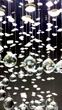 Delicate ball and square-shaped diamond crystals hang from a chandelier inside a house, glittering under the warm illumination from overhead lights