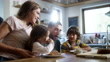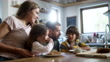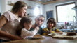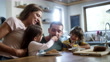 Slow motion of girl feeding father at kitchen counter. Smiling woman is caressing daughter's hair. Family is eating breakfast at home.