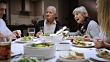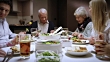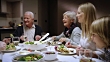 Medium panning shot of three generation family sitting at the dinner table, enjoying their meal and talking and smiling.