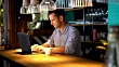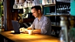 Happy business owner working on his laptop typing and smiling, while sitting in a restaurant