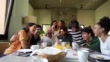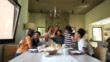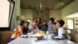 Multi-generation family is gathered at a dinning table and smiling.