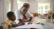 Homework, mother and girl with education, writing and bonding together with books and knowledge. Lounge, black family or mama with kid or child development with smile or learning with support or help - 4K stock video