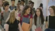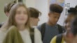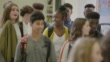 Junior high students walking in corridor. MS, rack focus, slow motion.