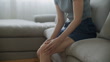 Knee pain ,asian woman massaging knee muscles while sitting on sofa in living room at home