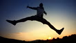 HD1080p: Super Slow Motion shot of a young man stretching out his arms and legs while jumping up in the air in the nature at sunset.