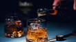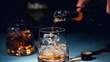 Close up of whiskey poured from a bottle into a glass with ice.