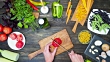 Preparing vegan minestrone with green beans and fresh herbs. Chopping a tomato. Overhead view