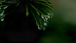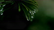Super slow motion extreme close up raindrops falling from green fir tree branch