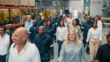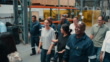 Team of factory workers walking into the warehouse to start work. Group of happy colleagues and cheerful staff leaving the workshop floor after the end of their shift to go home for the weekend - 4K stock video