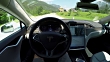 FPV: Tesla electric car self driving and turning on local road. Autonomous vehicle driving without a driver, line assistant turning the steering wheel
