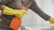 Woman cleaning kitchen counter with Spray
