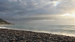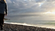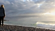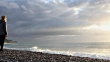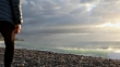 Woman looks across sea from empty beach, sunrise - 4K stock video