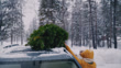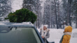 Slow motion shot of two women gives a high five to each other after loading a Christmas tree on a car roof. Car is parked somewhere in snowbounded woods.