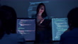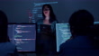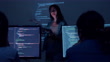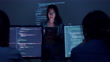 Young Asian woman software developers mentor leader manager talking to executive team analyzing source code in office at night. Programmer development. - 4K stock video