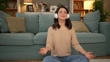 Young woman using headphones for guided meditation, in living room, eyes closed, relaxing - HD stock video